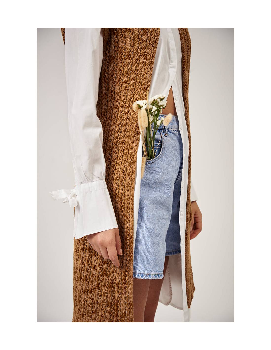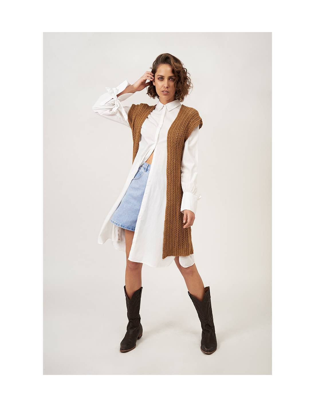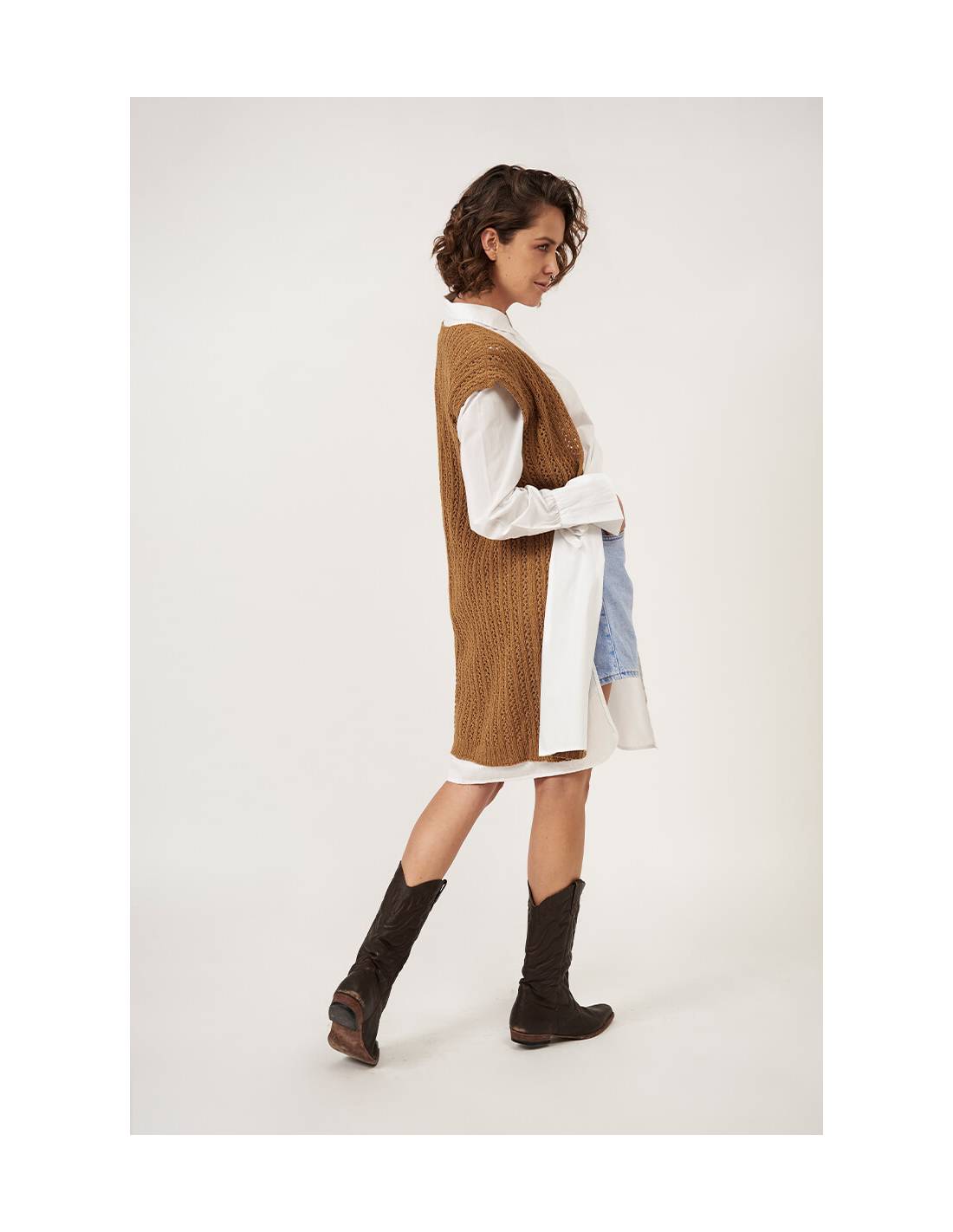 Patrón de tejido digital diseñado por Amy Gunderson. Incluye instrucciones para aprender a tejer el Chaleco Ana.