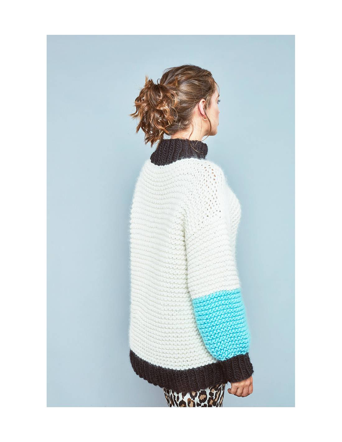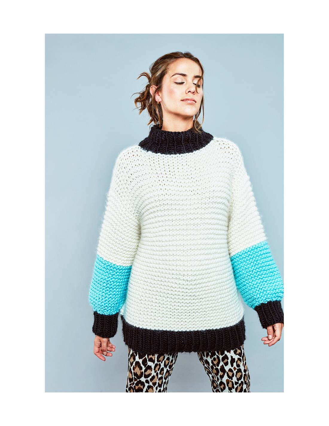 Patrón de tejido digital diseñado por Vanessa Coscarelli Black. Incluye instrucciones para aprender a tejer el Sweater Cristina.